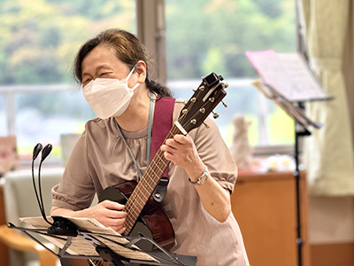 音楽療法士が、懐かしい昭和の歌や患者さんからリクエストされた思い出の曲を、歌にまつわるエピソードを交えながら歌います。ギターやフルート、ピアノの演奏が加わることも。コンサートでは、ナースと一緒にボランティアさんがベッド誘導のサポートを行います。体調の加減でラウンジに来られない方には、音楽療法士がお部屋を巡り、リクエストに応えます。