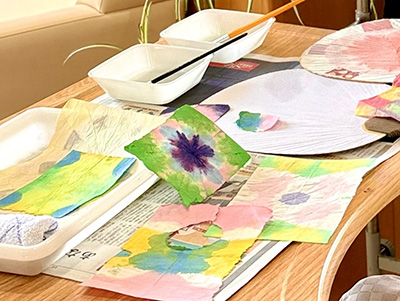例えば、春でしたら色粘土を団子に見立てる「花より団子アート」、夏は「うちわコラージュアート」等々、色々なテーマでしております。