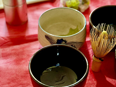 裏千家の先生がお部屋を巡って、お茶を点ててくださいます。先生がその日の朝に摘んで来られた季節の野花を籠に生けてご持参くださいます。その花々を見ると、患者さんのお顔がほころび、自然とお話が始まります。お抹茶の香り、お干菓子の上品な甘さを味わっていただけます。