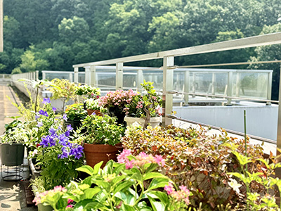 ラウンジからは、四季折々咲くベランダの花々が眺められます。園芸療法士さんが、毎週手入れに来てくださいます。室内でも、様々な種類の観葉植物や蘭をボランティアさんの手によって育てています。