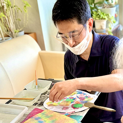 アートセラピストの斉藤秀敏さんの目指すアートセラピーは、誰でもできて、作りながら五感を豊かに刺激するような時間。夏は、ちぎった和紙のにじみ絵を貼ってうちわにしたり、冬は紙粘土を敷き詰めた木箱に鈴や松ぼっくり、リボンを置いてクリスマスの飾りを作ったり、思わず笑顔がこぼれる時間です。