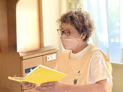 ベッドサイドで読み始めるボランティアさんの声が、心地よくお部屋に響きます。人の声の力は大きくて、心地よいひびき。お部屋中に笑いがこぼれたり、お母さんとの思い出がふと蘇って涙されたり、そんな輝きのひとときです。