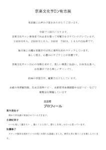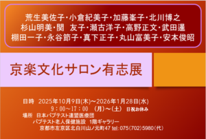 第50回は、京楽文化サロン有志展を開催いたします。今回で三回目となりますが、14名もの方々の作品を展示していただいています。京都市近郊の風景や日常にある物など、水彩画の優しい色彩が心を和ませてくれます。どうぞお楽しみください。