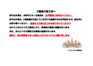 2025年 11月 27日 ご面会時のお願い 重要なお知らせ このたび、皆様からのご要望にお応えし、一定のルールを守っていただくことを条件に、12月1日(月)より持ち込み食をお持ちいただけます。 健康と安全を第一に考え、皆さまに安心してご利用いただけるよう下記の通りルールを設けております。どうかご理解とご協力をお願いいたします。