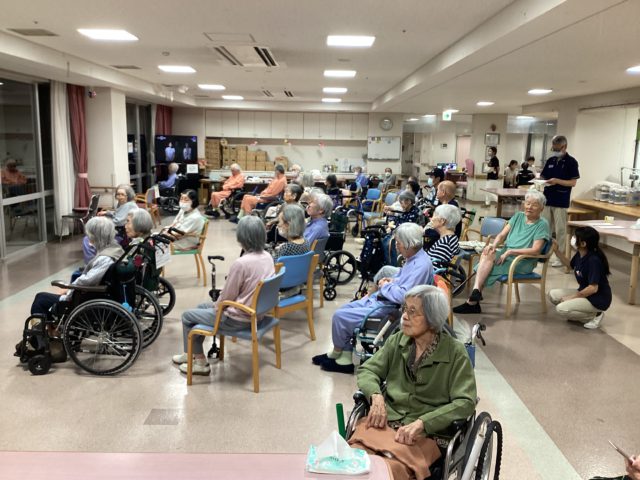 老健からは如意ヶ嶽の大文字が近く、間近で送り火の迫力を感じることが出来ます。ここ数年はコロナ渦の為、利用者様と職員のみで鑑賞していましたが今年からは数名ですが家人様もご一緒に鑑賞されています。鑑賞前は小雨が降り、心配していましたが無事に灯がともり、家人様と共に穏やかな表情で年1回の行事をとても楽しく過ごされておられました。利用者様からは「夏の風物詩やね」、「1年ほんま早いわ」等の声か聞かれました。