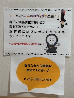 2025年 10月 31日 ハロウィンイベント 10月はハロウィンですね! カボチャを飾ったり、お化けの絵を探すイベントを催しています。 利用者さんはスタッフと秋を楽しんで過ごしています。 療養棟ではハロウィンを盛り上げています。 フロアの中にこのお化けが何匹いるでしょうか? みなさん、見つけられましたか? ほら、ここに! よく見るとあっちにも! ハロウィンのおやつはカボチャのプリン♪