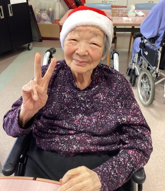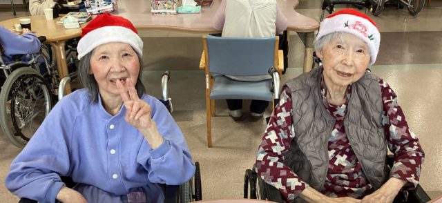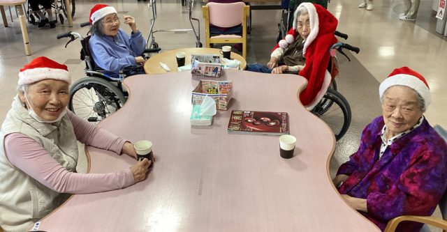 12月24日、おやつの時間に合わせてクリスマス会を行いました。 シャンメリーで乾杯し、とろみが必要な方にはマスカットジュースをご用意しました。ショートケーキと一緒に、皆さま思い思いにお楽しみいただきました。