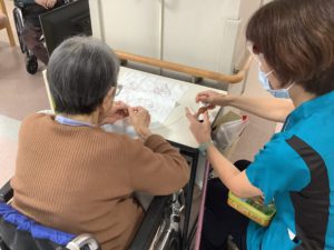 また、一般入所の方は、入所から3カ月間、週3回までの回数で認知症短期集中リハビリテーションも行っています。このリハビリは、認知症の進行予防と改善を目的に、計算課題や漢字の書き取り、数字並べゲームなどの学習療法や、折り紙や塗り絵、縫い物などの作業活動など、ご利用者の状況やご希望に応じて取り組んでいます。