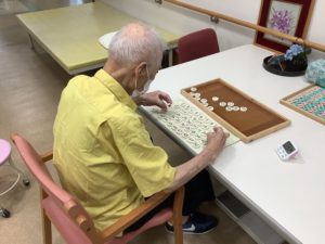 また、一般入所の方は、入所から3カ月間、週3回までの回数で認知症短期集中リハビリテーションも行っています。このリハビリは、認知症の進行予防と改善を目的に、計算課題や漢字の書き取り、数字並べゲームなどの学習療法や、折り紙や塗り絵、縫い物などの作業活動など、ご利用者の状況やご希望に応じて取り組んでいます。